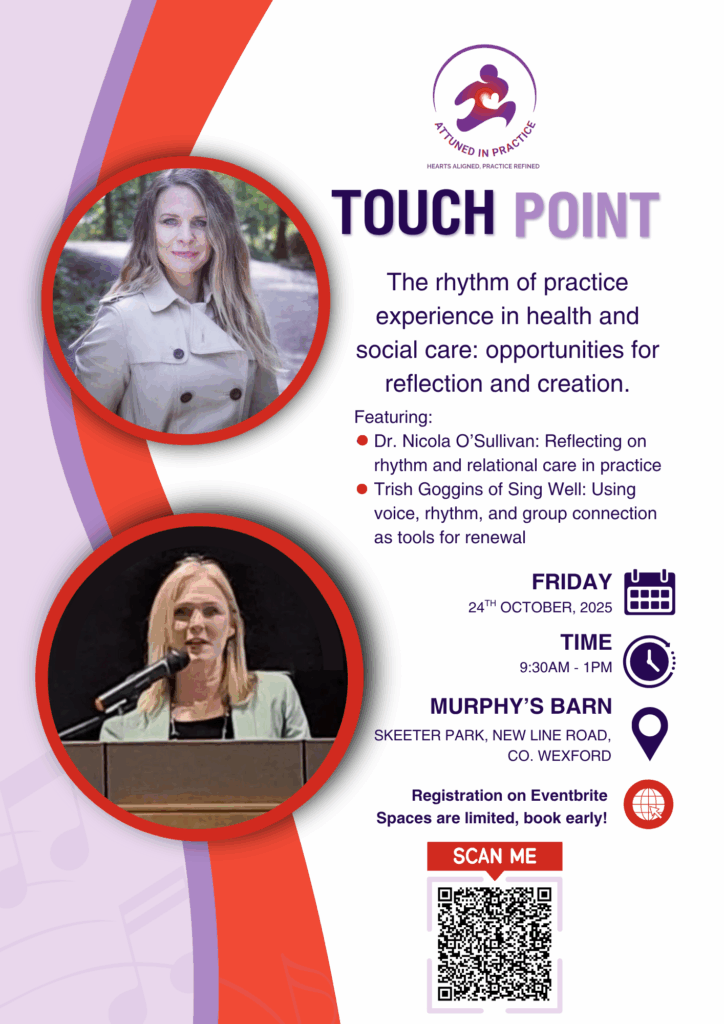 Join us for a restorative half-day Touchpoint in the beautiful setting of Murphy’s Barn, Wexford, where we’ll explore rhythm, renewal, and connection in frontline practice.